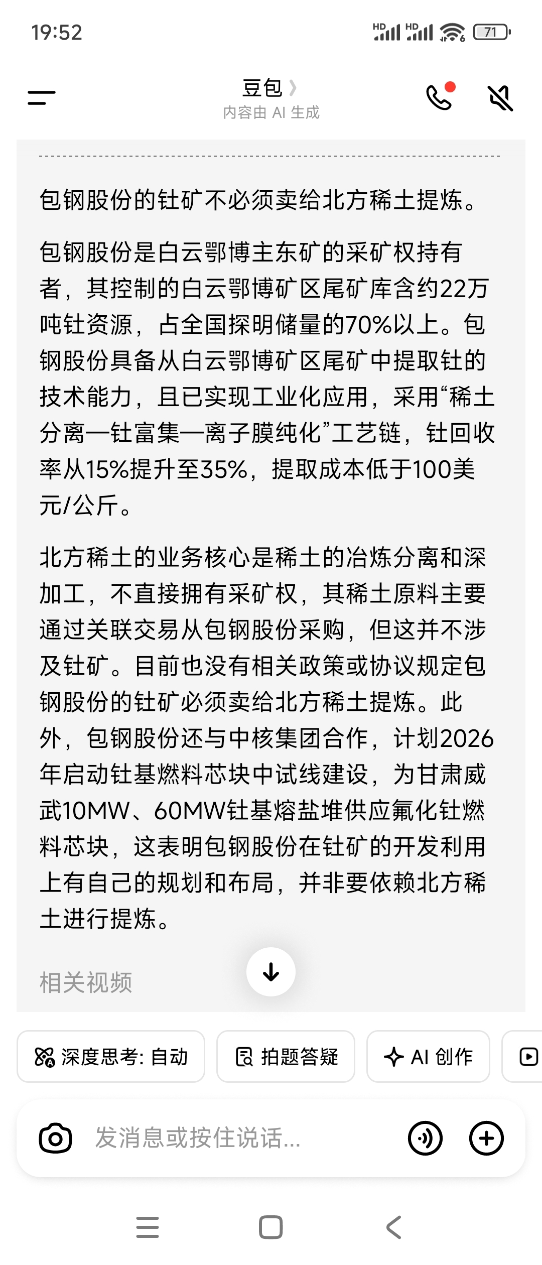 包钢股份的钍矿不用卖给包钢稀土提炼,完全自主分选提炼出售