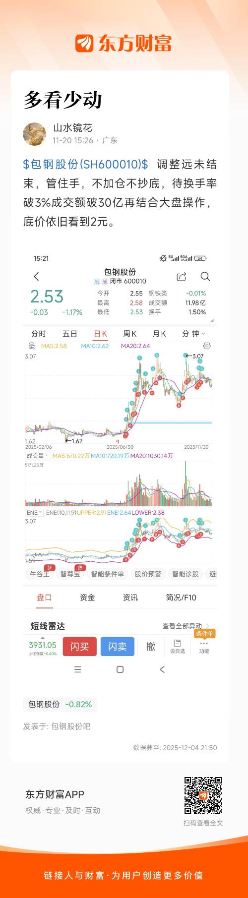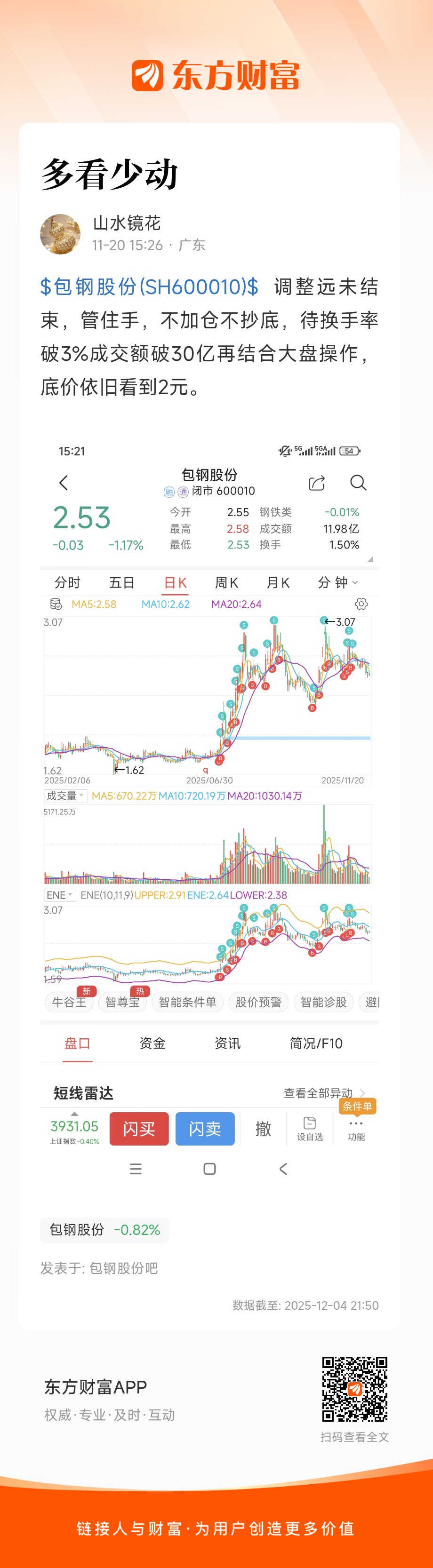 $包钢股份(SH600010)$ 调整远未结束,管住手,不加仓不抄底,待换手率破3%成交额破30亿再结合大盘操作,底价依旧看到2元。
