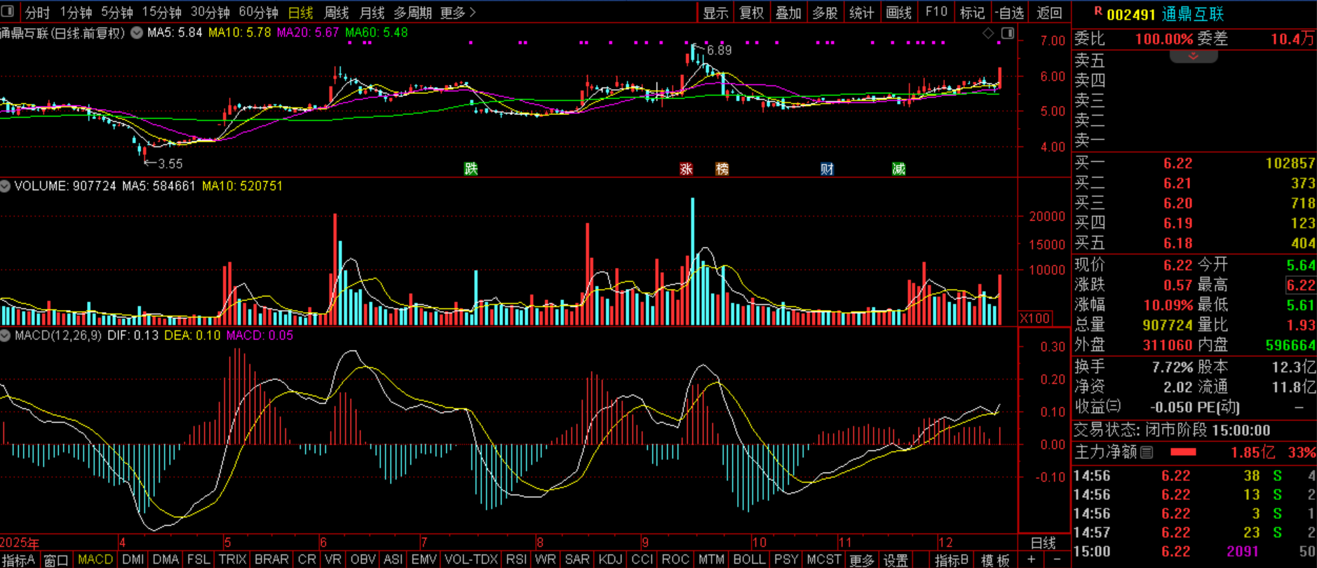通鼎互联(SZ002491):固态电池+通信线缆+储能消防+光纤光缆+光通信+数字水印+业绩增长。该司几点亮点:一、公司持有上海屹锂新能源科技有限公司股份,而此公司专注硫化物全固态电池及关键材料研发与产业化;二、公司光电通信业务涵盖光纤预制棒—光纤—光缆—通信设备完整产业链;三、该司已成为国内三大电信运营商重要供应商,并持续拓展光通信设备、无线通信设备、网络安全、通信电源、集成总包及新能源等业务。上述这些都是未来科技发展的重要方向,是国内经济转型的重点,未来随着行业的良性发展,业绩大增,估值修复是大概率,所以该股估值优势明显,值得投资。从技术的层面看,该股最近两个月虽一直在震荡筑底,不过底部始终不破4.90,并且量能呈现上涨放量,下跌缩量模式,并且最近一个月均在60日线上稳稳运行,这是蓄势的表征,昨日该股放量拉涨封板,突破了近期的盘整带,这是趋势开启的信号,而该股的上涨预期存在,所以后市继续走涨无忧。料今日该股有望继续走高,分歧走水的话,机遇大于风险,值得研究。