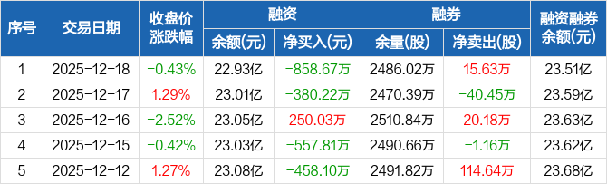 融资方面,当日融资买入1.1亿元,融资偿还1.18亿元,融资净偿还858.67万元。融券方面,融券卖出20.34万股,融券偿还4.71万股,融券余量2486.02万股,融券余额5817.29万元。融资融券余额合计23.51亿元。