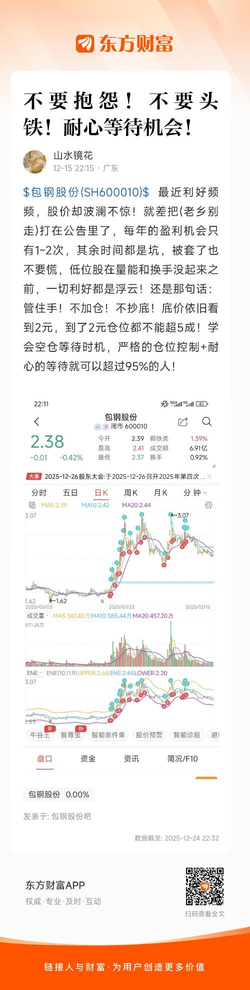 $包钢股份(SH600010)$ 最近利好频频,股价却波澜不惊!就差把(老乡别走)打在公告里了,每年的盈利机会只有1~2次,其余时间都是坑,被套了也不要慌,低位股在量能和换手没起来之前,一切利好都是浮云!还是那句话:管住手!不加仓!不抄底!底价依旧看到2元,到了2元仓位都不能超5成!学会空仓等待时机,严格的仓位控制+耐心的等待就可以超过95%的人!
