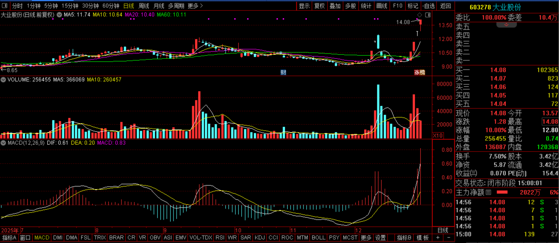 大业股份(SZ603278):商业航天+腱绳+胎圈钢丝+扭亏+人形机器人+光伏。今日早盘该股开盘就急速探底,不过在昨日收盘价附近猪力护盘坚挺,其后该股继续拉涨封板,量能大为缩减,这是典型的加速上涨行情,料后市新高无忧,如果后市能够突破15.43的话,新的上涨空间打开,这个还是到时候再详细分析吧。