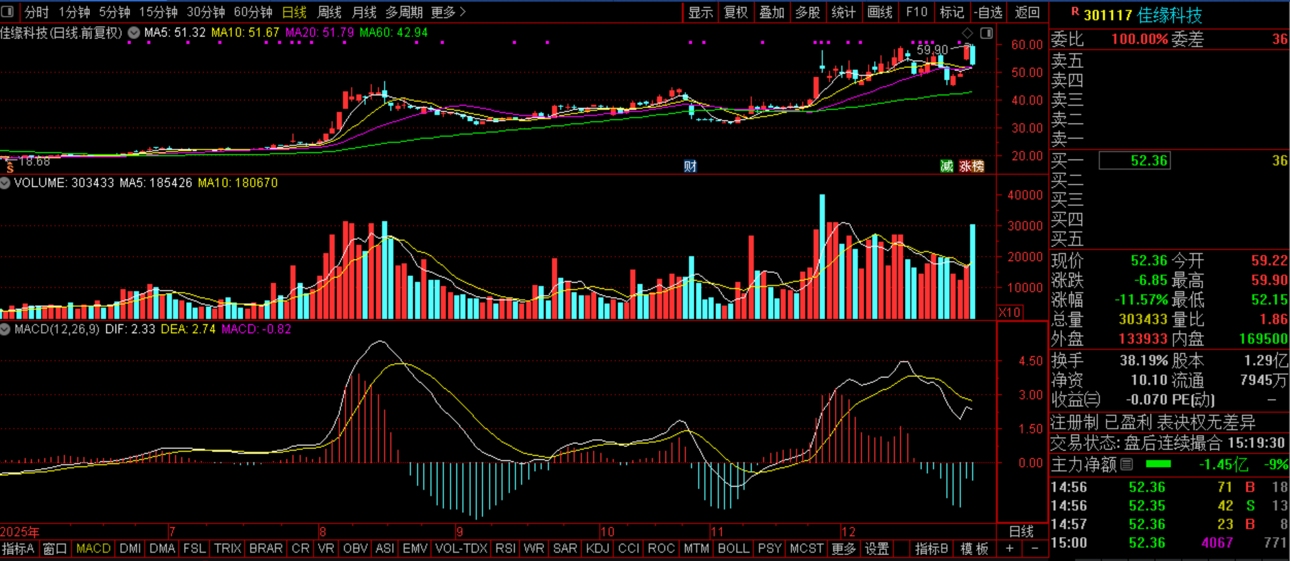 佳缘科技(CY301117):商业航天+网络安全+AI医疗+军工+华为算力+华为昇腾+SIP芯片。今日该股开盘稍冲就急速回落,午后加速回落,最终大跌11个点并量能放大,不过好在股价仍坚守在20日线上,该股的上涨形态未被破坏,所以笔者以为这是良性分歧,是猪力的震仓洗盘,而该股的上涨预期仍在,所以后市继续拉涨无忧。明日很关键,如果止跌的话,可能再次迎来机遇。