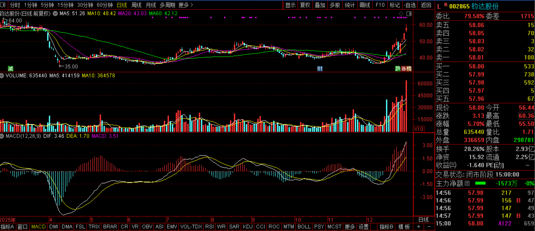 钧达股份(SZ600179:海南自贸区+钙钛矿电池+海外占比+TOPCon电池+钙钛矿太空应用。今日该股开盘略微探底就快速拉涨封板,可惜的是未能稳住,其后炸板回落,午后更是在大盘的拖累下继续走低,最终收上影线,量能放出历史之最,一般这种走势在趋势的末端都是上涨的终结,不过由于该股才刚启动上涨,又是市场热点,所以目前这种走势更可能是猪力的试仓动作,新紫金进场的表征,是良性的上涨,料后市继续走涨,还是应该继续研究关住。如果明日继续分歧走水的话,可能偏于机遇。这个具体明早细说。