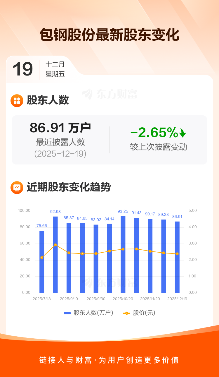 包钢股份:截至12月19日最新股东户数86.91万户,较上期减少2.65%