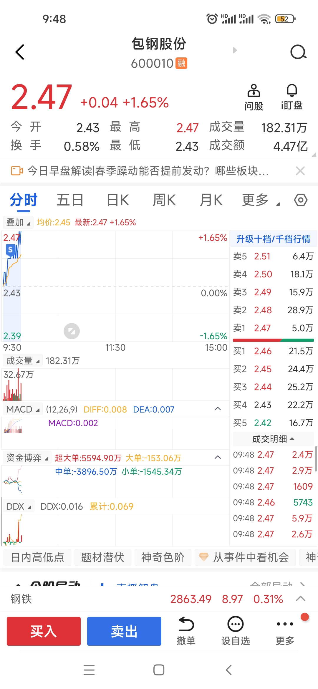 $包钢股份(SH600010)$ 为了防止套牢,周一早上,我在 2.45元已全仓卖出了。