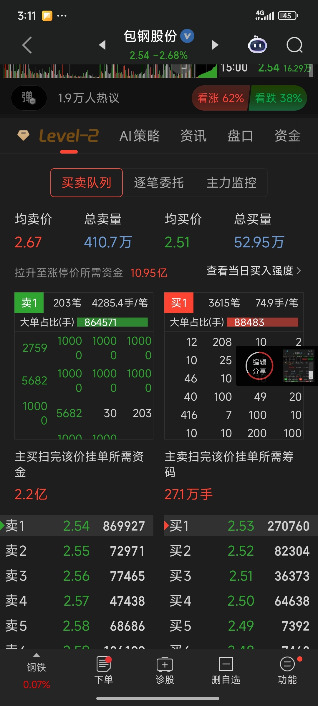 $包钢股份(SH600010)$ 87万手压单,2.2亿都是万手大单,主力告诉我们手里最起码有这么多货,要出货是拉高,要打压是要吸筹。现在稀土镨钕氧化物大涨,主力压不住了。