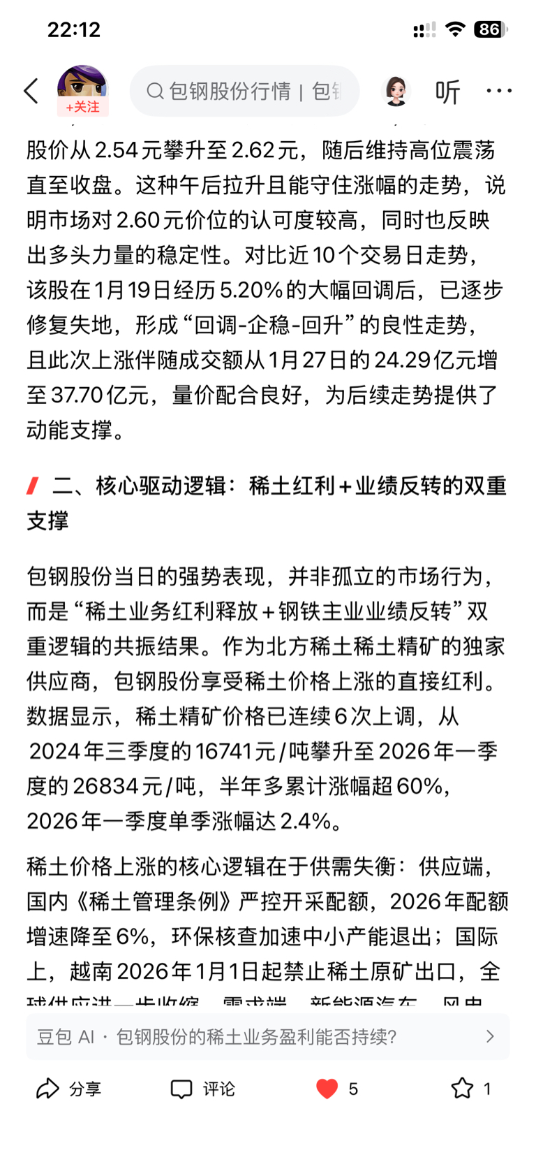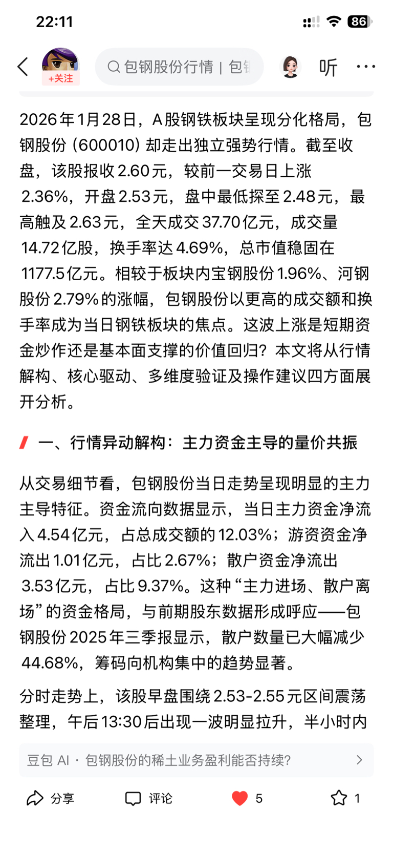 包钢股份在2026年1月28日逆势上涨,收盘价2.60元,涨幅2.36%,成交额37.70亿元,主要受主力资金和稀土业务红利驱动。