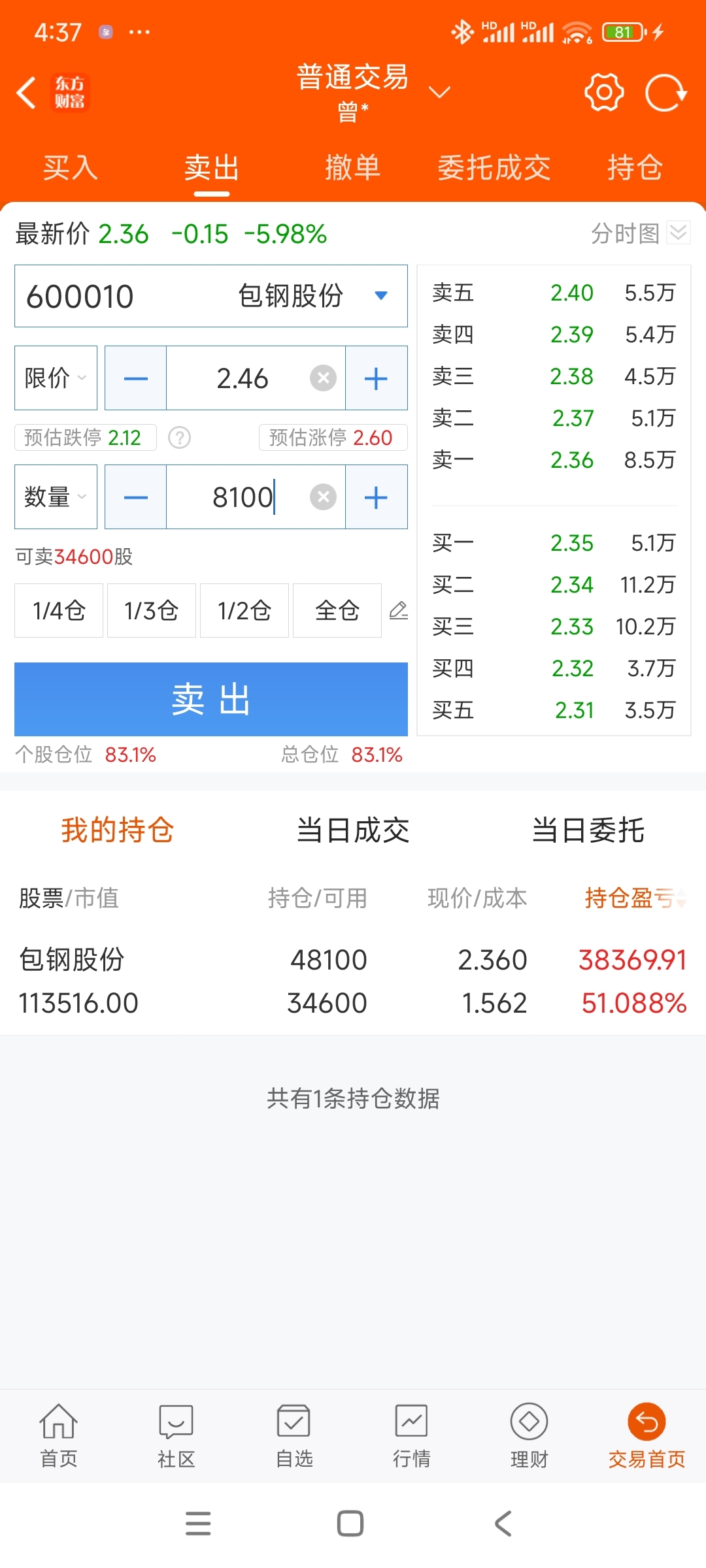 $包钢股份(SH600010)$ 朱丽!今天2.38买入的明天2.46能让我做个小t出来吗
