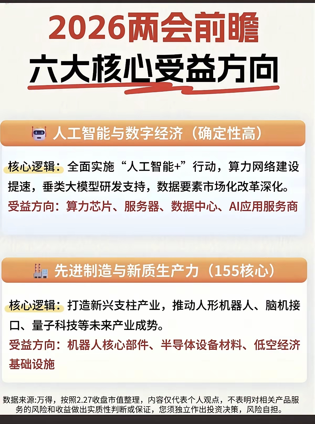 2026两会前瞻:六大核心受益方向!1.人工智能与数字经济2.先进制造与新质生产
