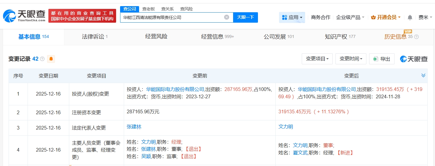 南方财经12月23日电,天眼查App显示,近日,华能江西清洁能源有限责任公司发生工商变更,注册资本由约28.7亿人民币增至约31.9亿人民币,增幅约11%,张建林卸任法定代表人,由文力明接任,同时部分高管发生变更。该公司成立于2013年7月,经营范围包括发电业务、输电业务、供电业务等,由华能国际(600011)全资持股。
