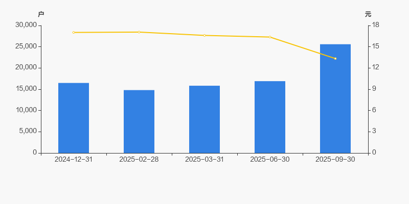自2025年2月28日以来,公司股东户数连续3期上涨,截至目前增幅为72.88%。2025年2月28日至2025年9月30日区间股价下降21.93%。