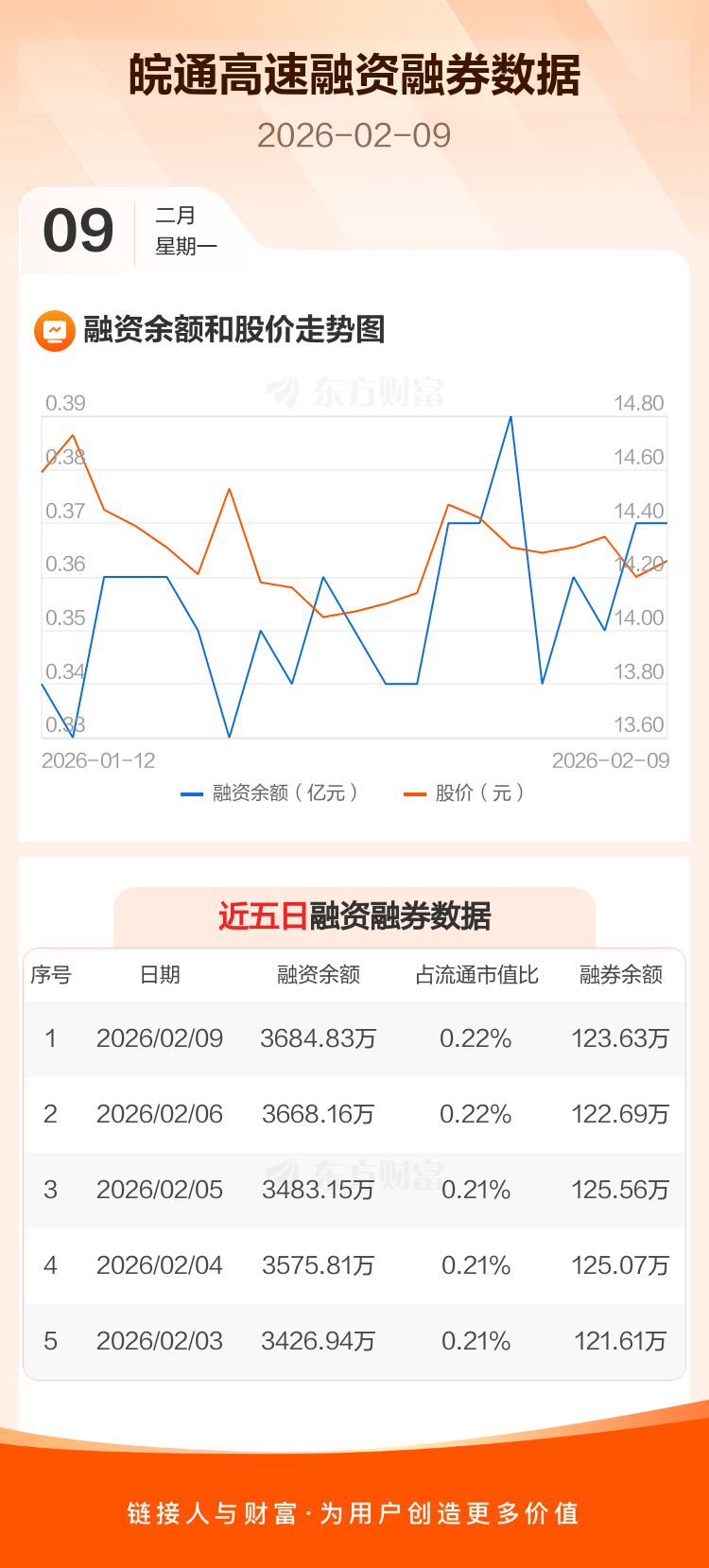 交易所最新数据显示,皖通高速于2026年2月9日获融资买入399.81万元,融资偿还383.14万元,当日融资净买入16.67万元。目前,该股融资余额3684.83万,占流通市值比例为0.22%。