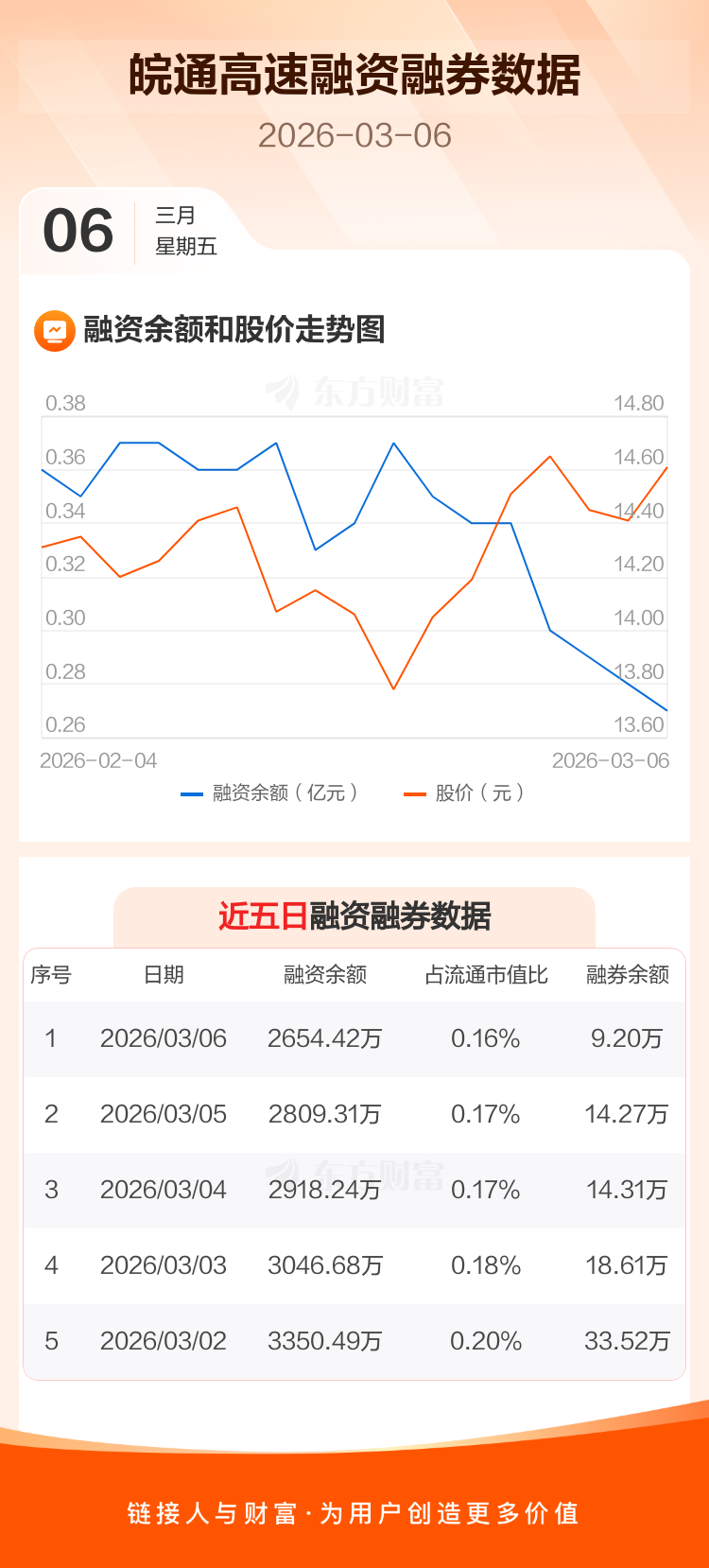 交易所最新数据显示,皖通高速于2026年3月6日获融资买入276.01万元,融资偿还430.90万元,当日融资净偿还154.89万元。目前,该股融资余额2654.42万,占流通市值比例为0.16%。