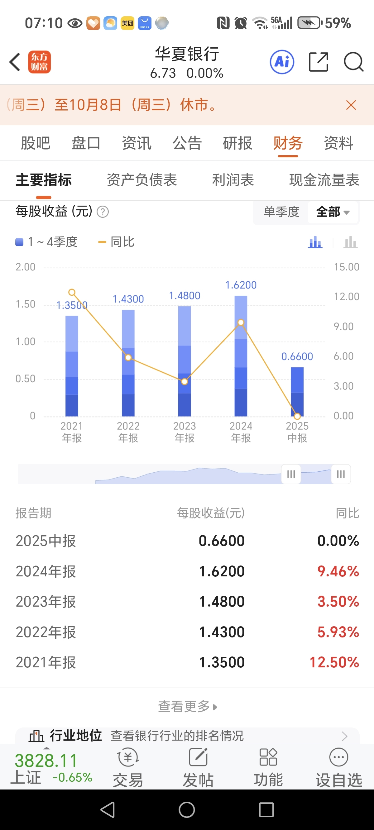 $华夏银行(SH600015)$ $工商银行(SH601398)$ $农业银行(SH601288)$ 华夏银行被错杀的银行股,中报每股收益与去年持平,市值今年下降18%