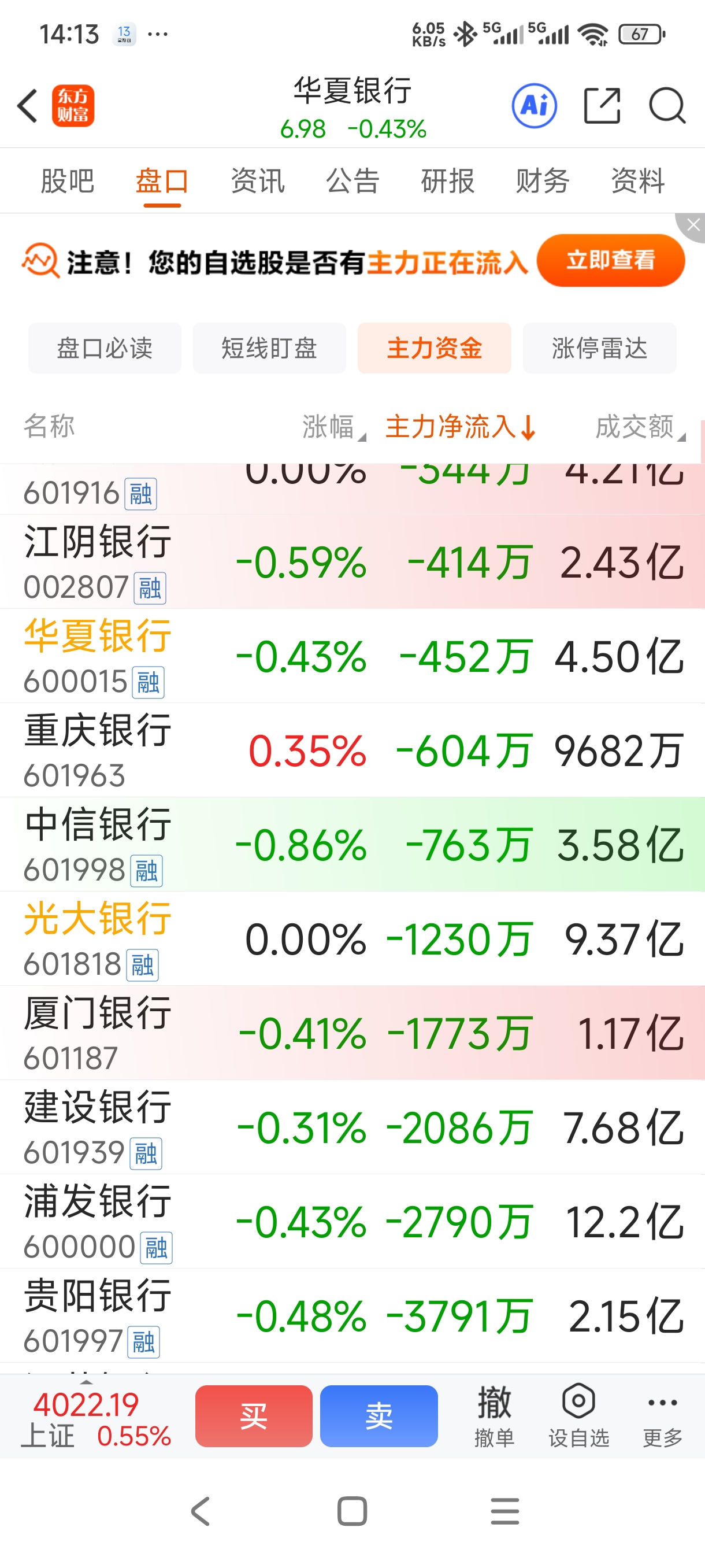 $华夏银行(SH600015)$ 主力资金在银行业都是流出靠前几名的还想涨?