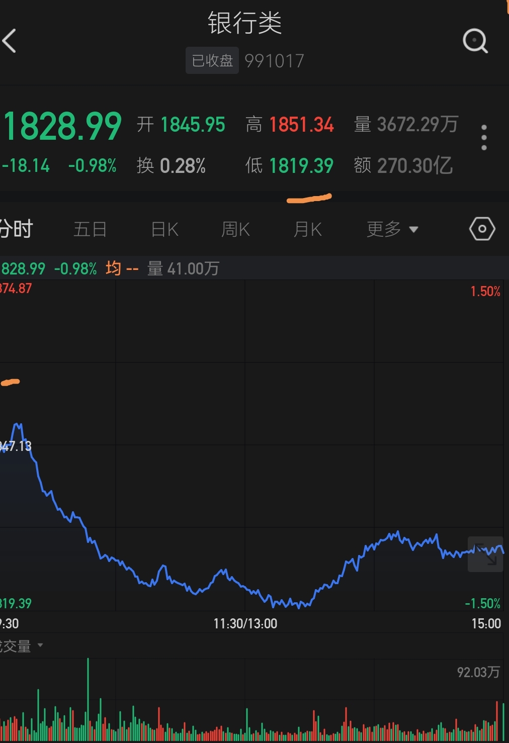 收盘发个截图1024x683的像素截图,银行指1819.39最低后四位,而且是今
