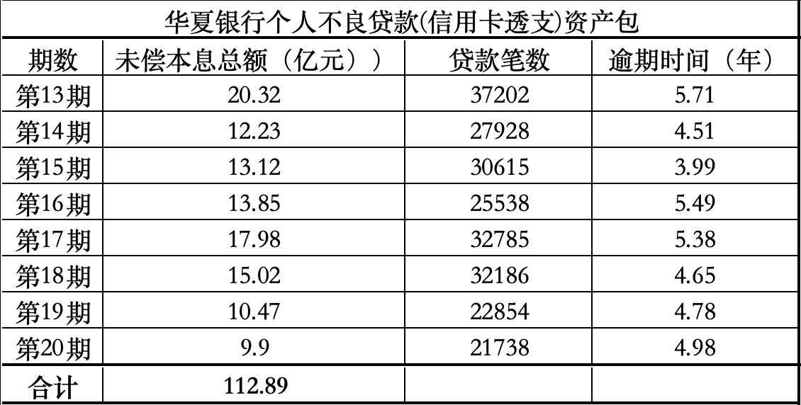 12月3日至4日,华夏信用卡中心集中推出第13-20期共8个不良贷款资产包,全部为信用卡透支类不良贷款,未偿本息总额合计113亿元,规模创下近期行业单机构处置新高。