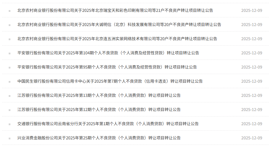 12月9日当天,银登中心公开信息显示,又密集“上新”了一大批银行的不良资产,涉及多家银行,包括多家国有大行。