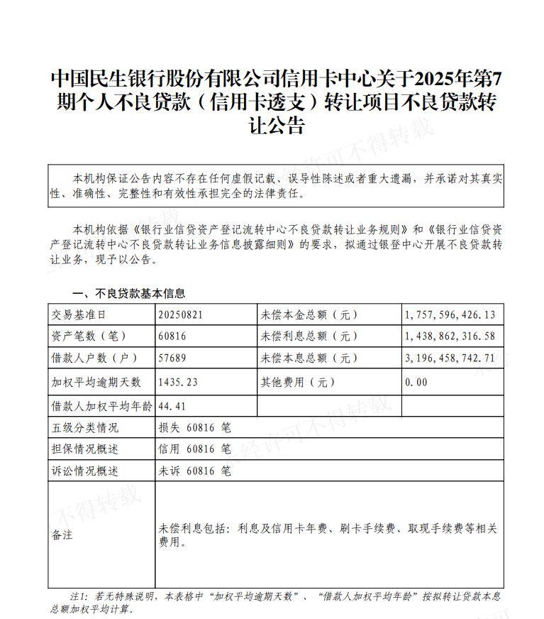 其中,民生银行也挂牌转让31.96亿信用卡不良资产包。民生银行本次转让项目为2025年第7期个人不良贷款(信用卡透支),其中涉及60816笔贷款、57689户借款人。该项目涉及的未偿本金总额为17.57亿元,未偿利息总额为14.39亿元,未偿本息合计达31.96亿元。