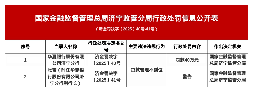 华夏银行济宁分行被罚40万,涉贷款管理不到位