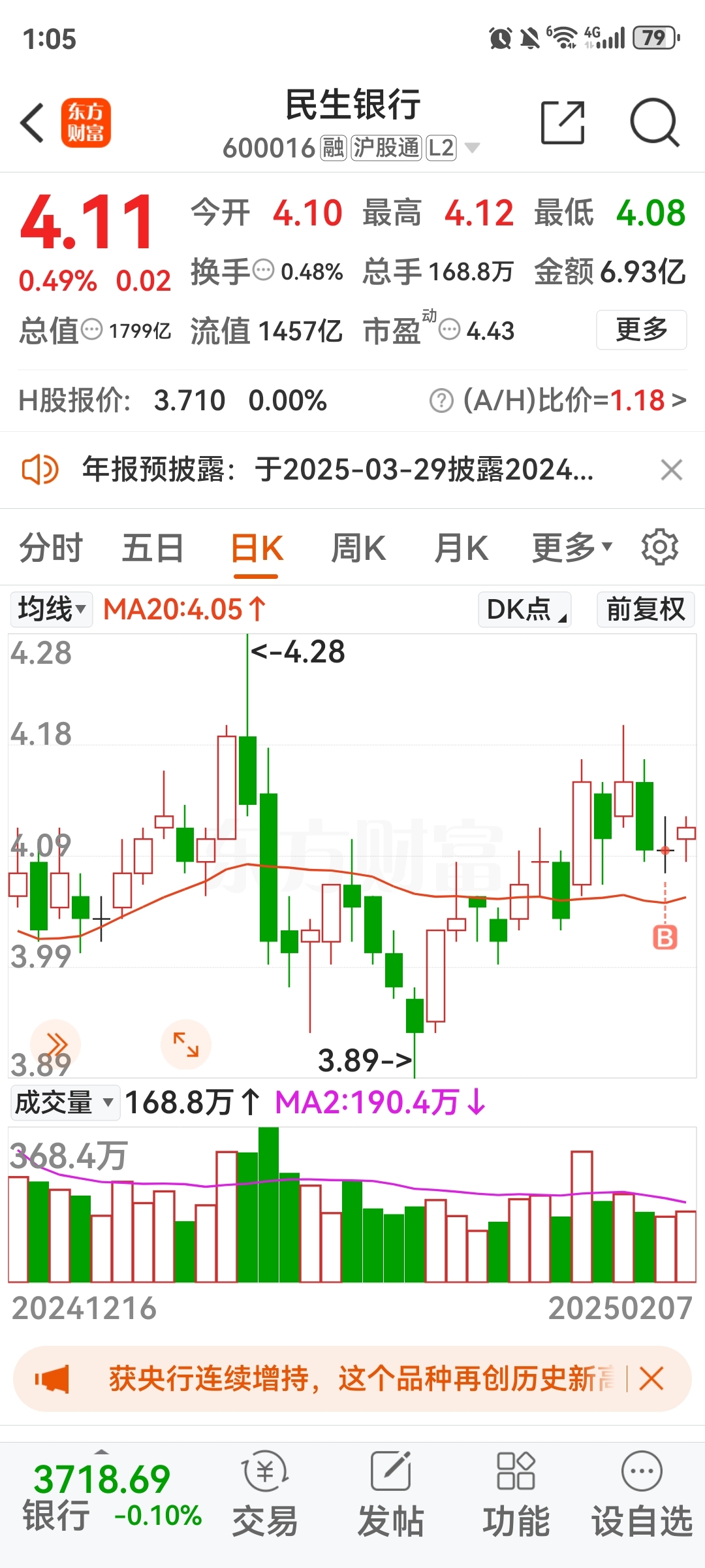$民生银行(SH600016)$ 周一涨三分就行了死交量放到180万左右就完美了