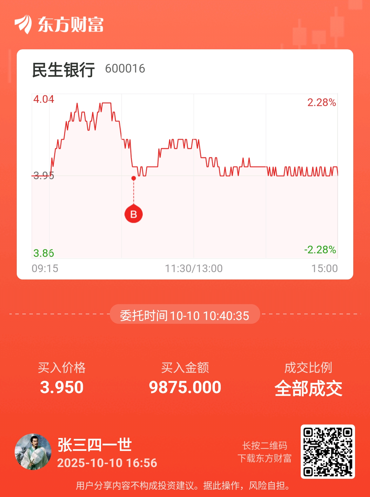 $民生银行(SH600016)$ 今日3.95新进民生银行4000股,至于后续如何操作,持续评论跟进!敬请关注!