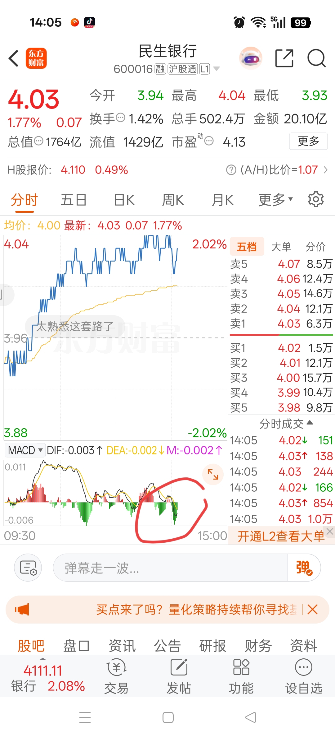 $民生银行(SH600016)$ 今天必定下来,已经顶背离了。