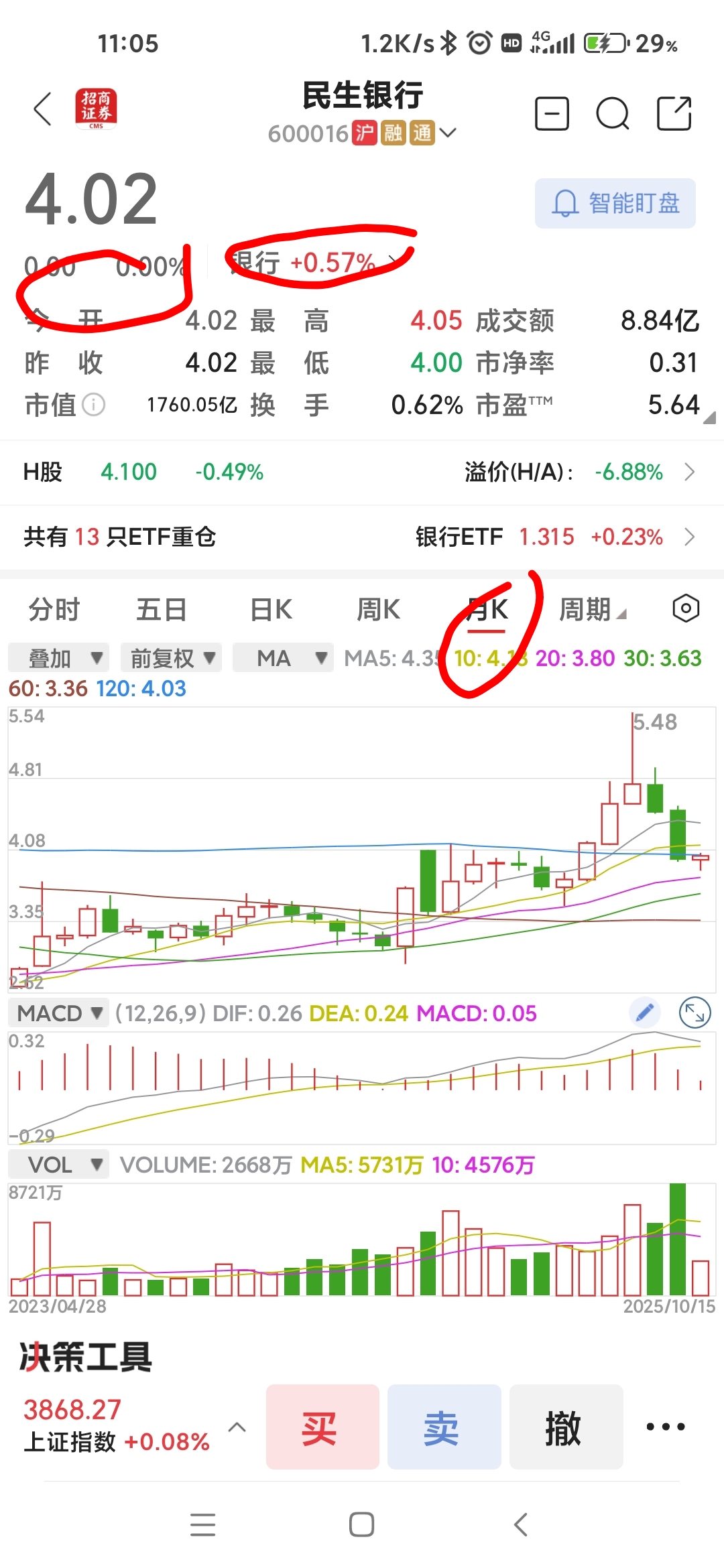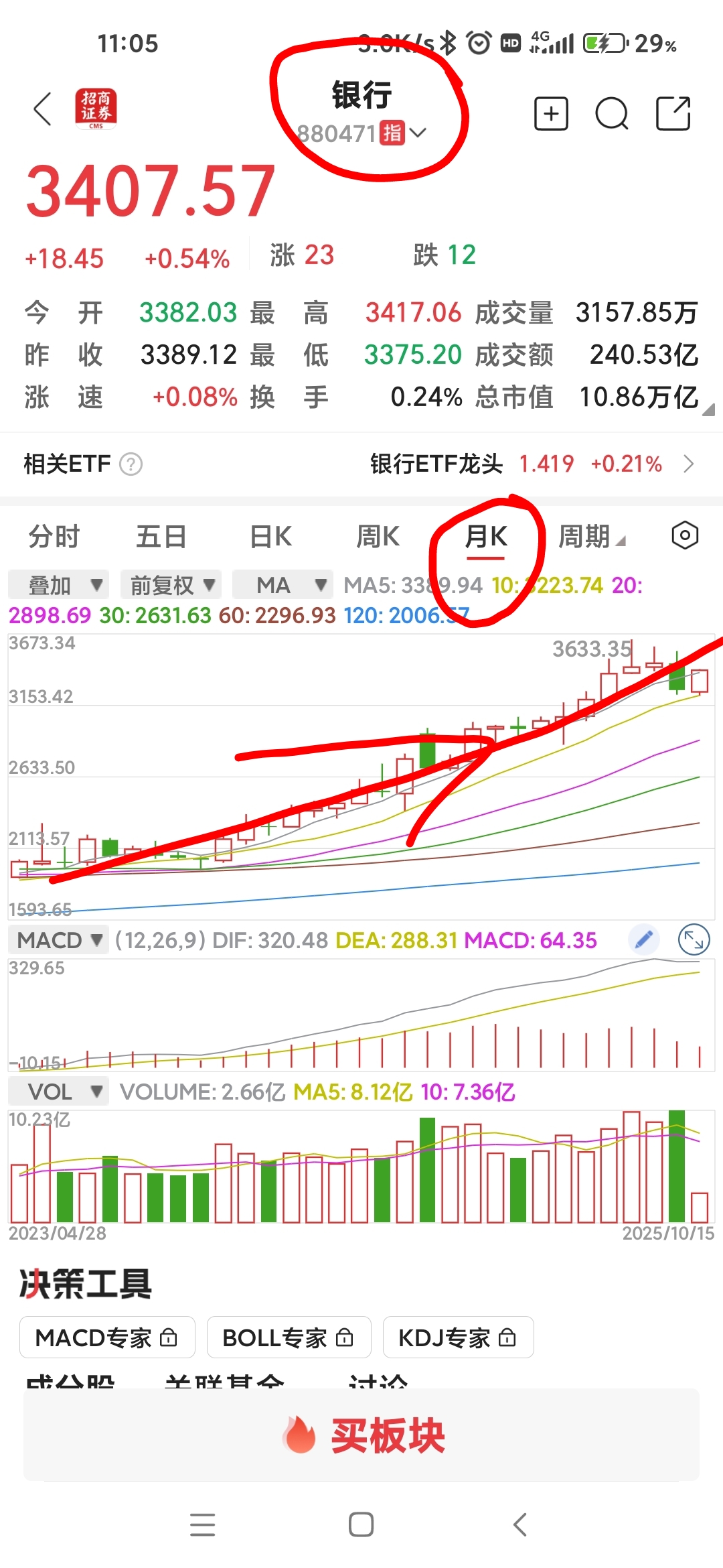 打开板块月K线与民生银行K线一对比!你们就知道民生银行是多么的垃圾!还要有人吹民