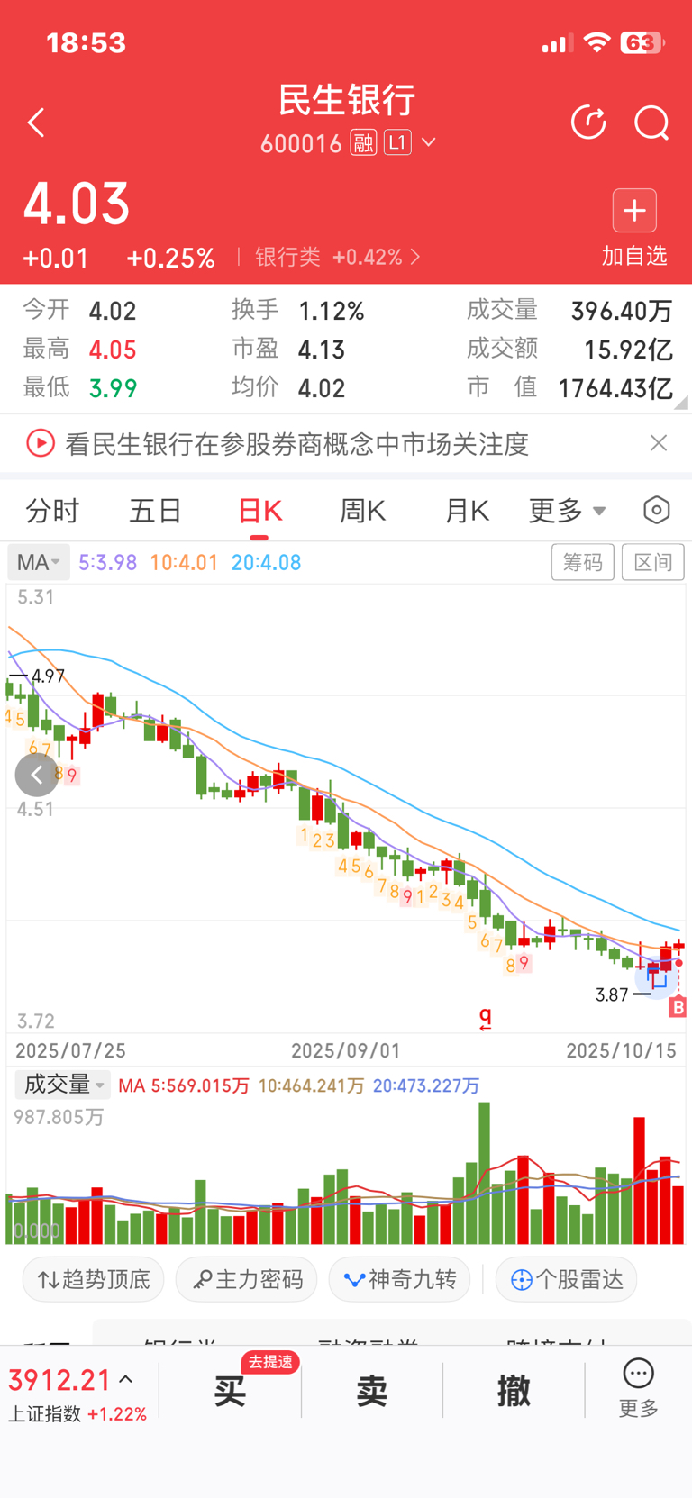 $民生银行(SH600016)$ 成本4元。有搞头吗?市净率才0.31。这么优质的股下跌是为了接我上车吧。
