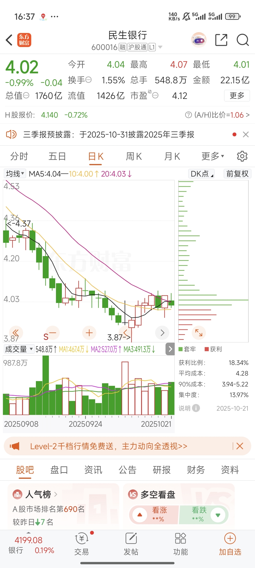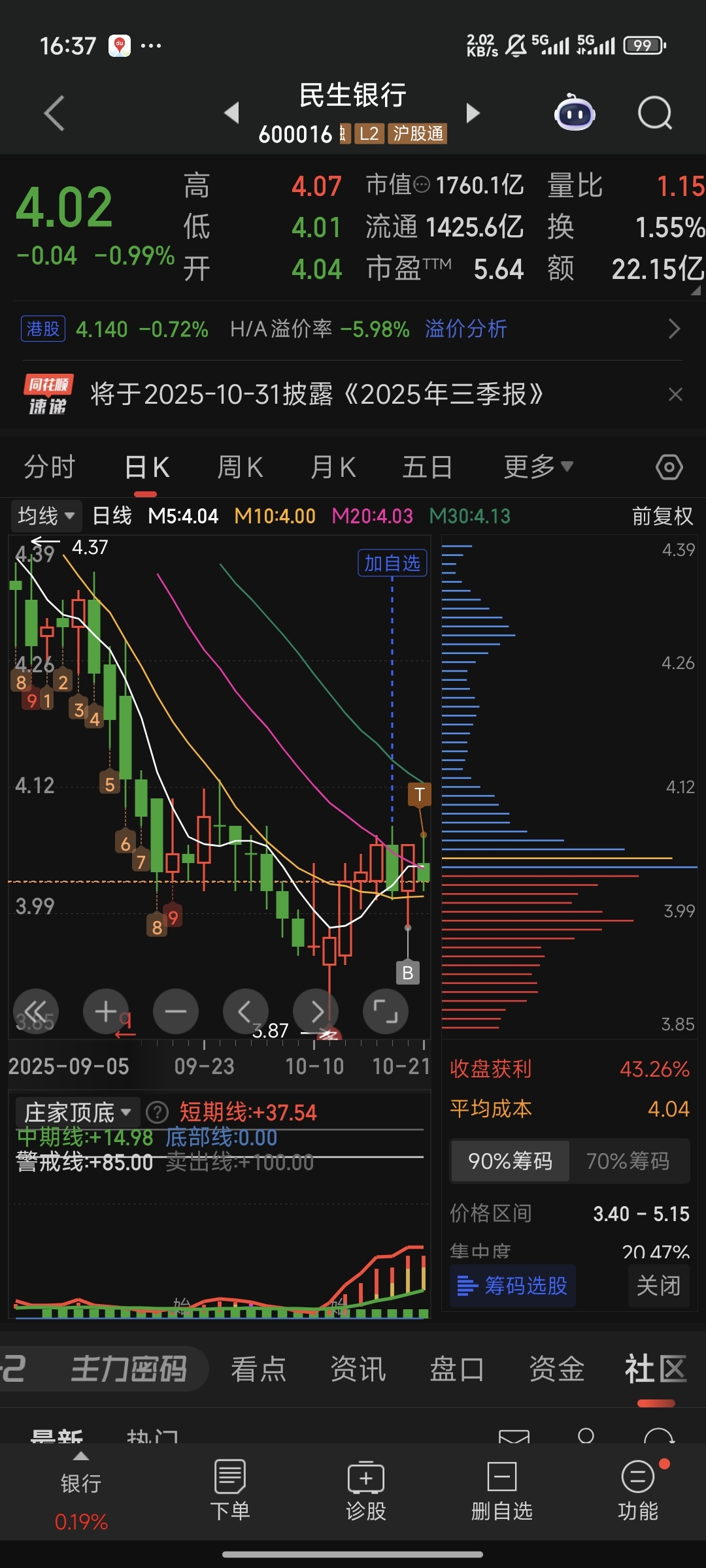 为什么在同花顺和这里看到的平均筹码不一样,同花顺是4.04,这边是4.28,差的