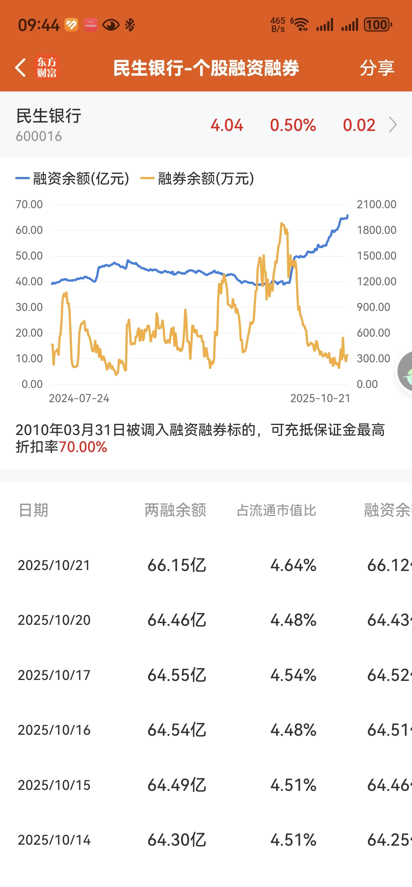 $民生银行(SH600016)$ 融资新高!股价阶段新低!
