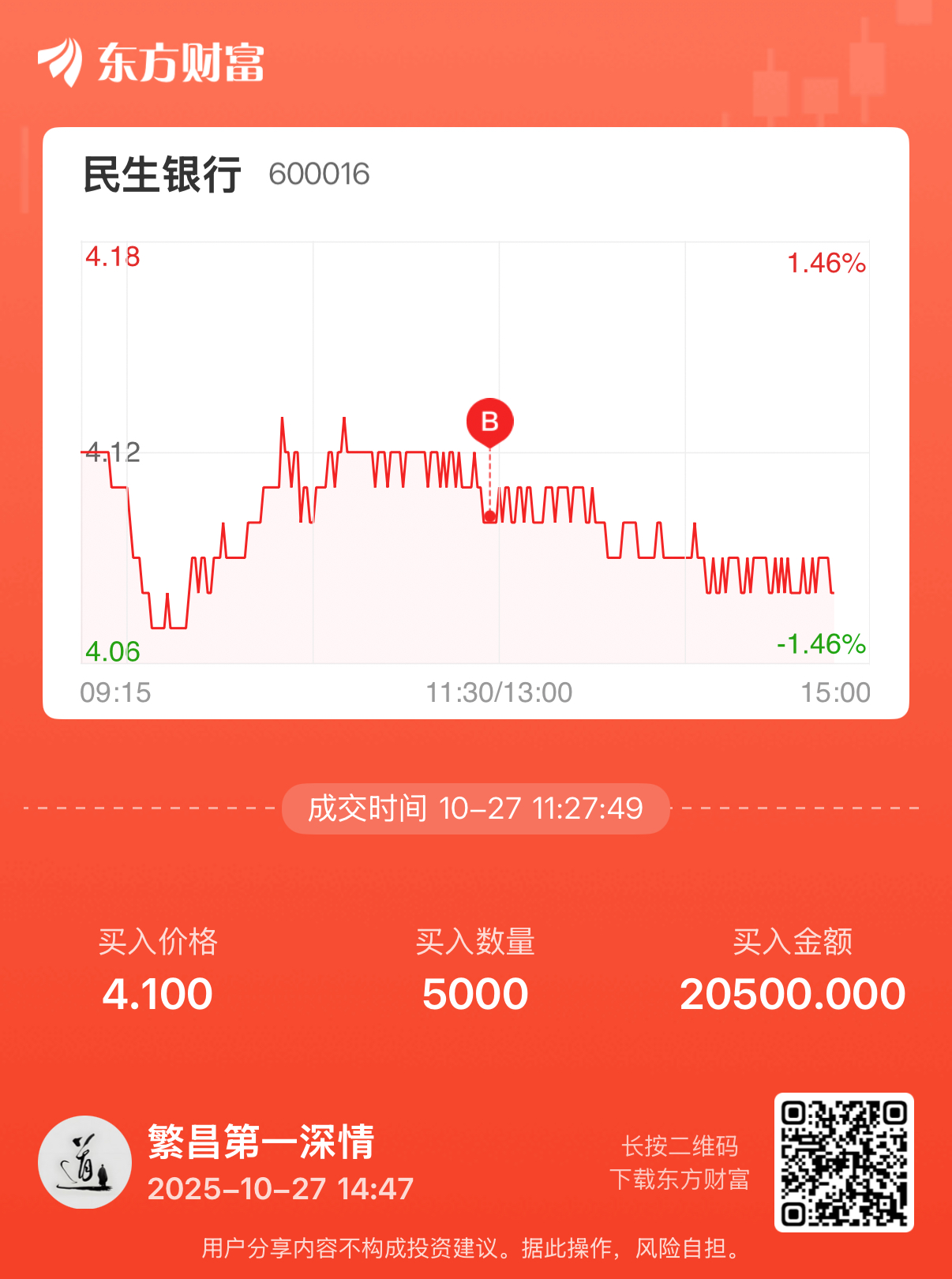 昨天有人说我买民生银行就不是正常人,今天又加了50手,必须对着干今日成交股票:操