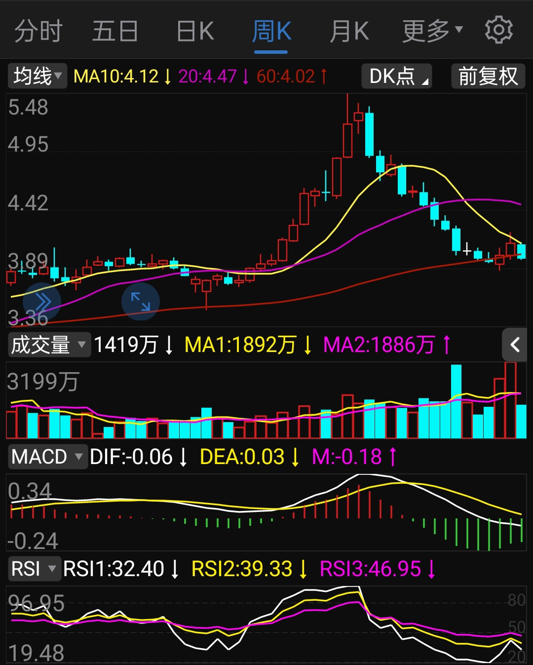 周线走势,可能会去探前期低点,3.5附近应该有支撑。