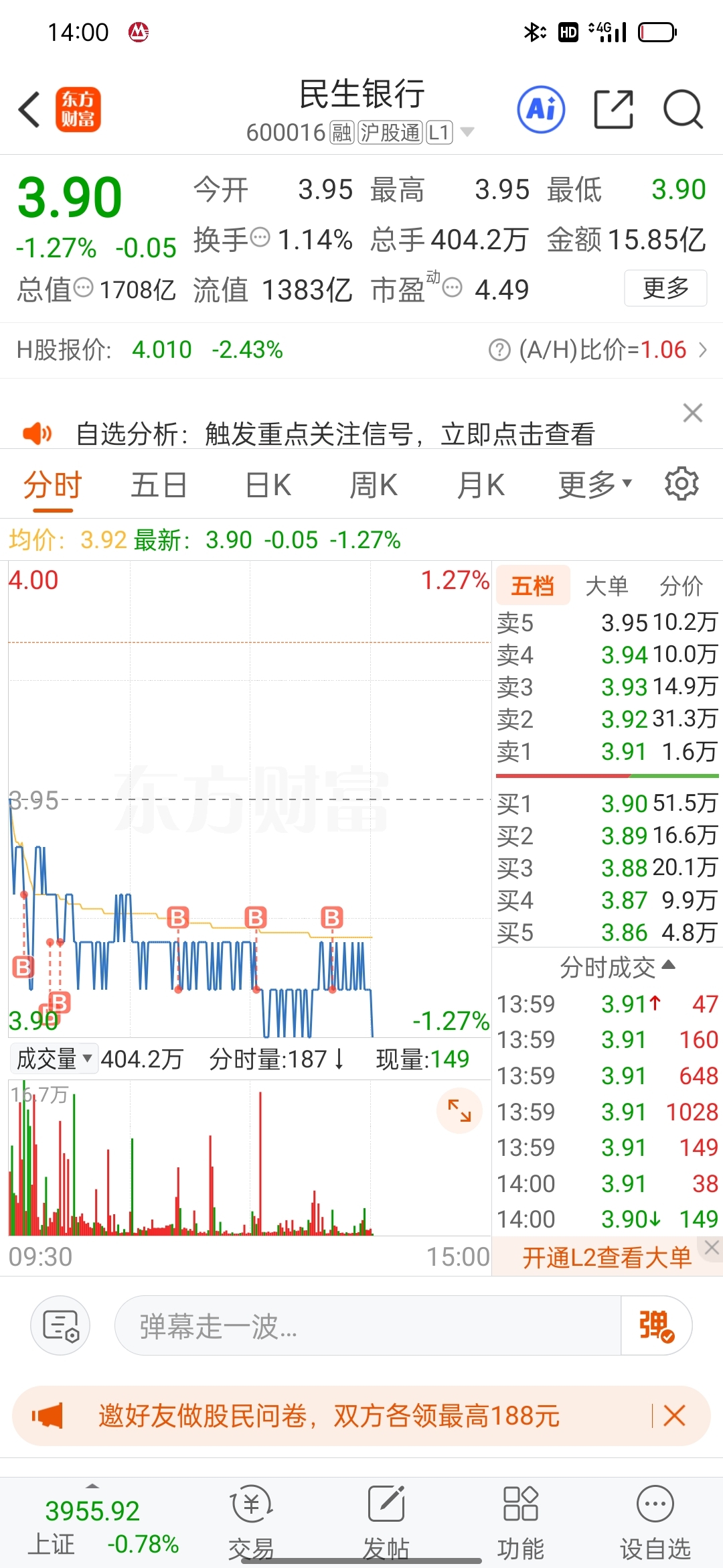 $民生银行(SH600016)$ 欢迎空gou贱卖自己的筹码