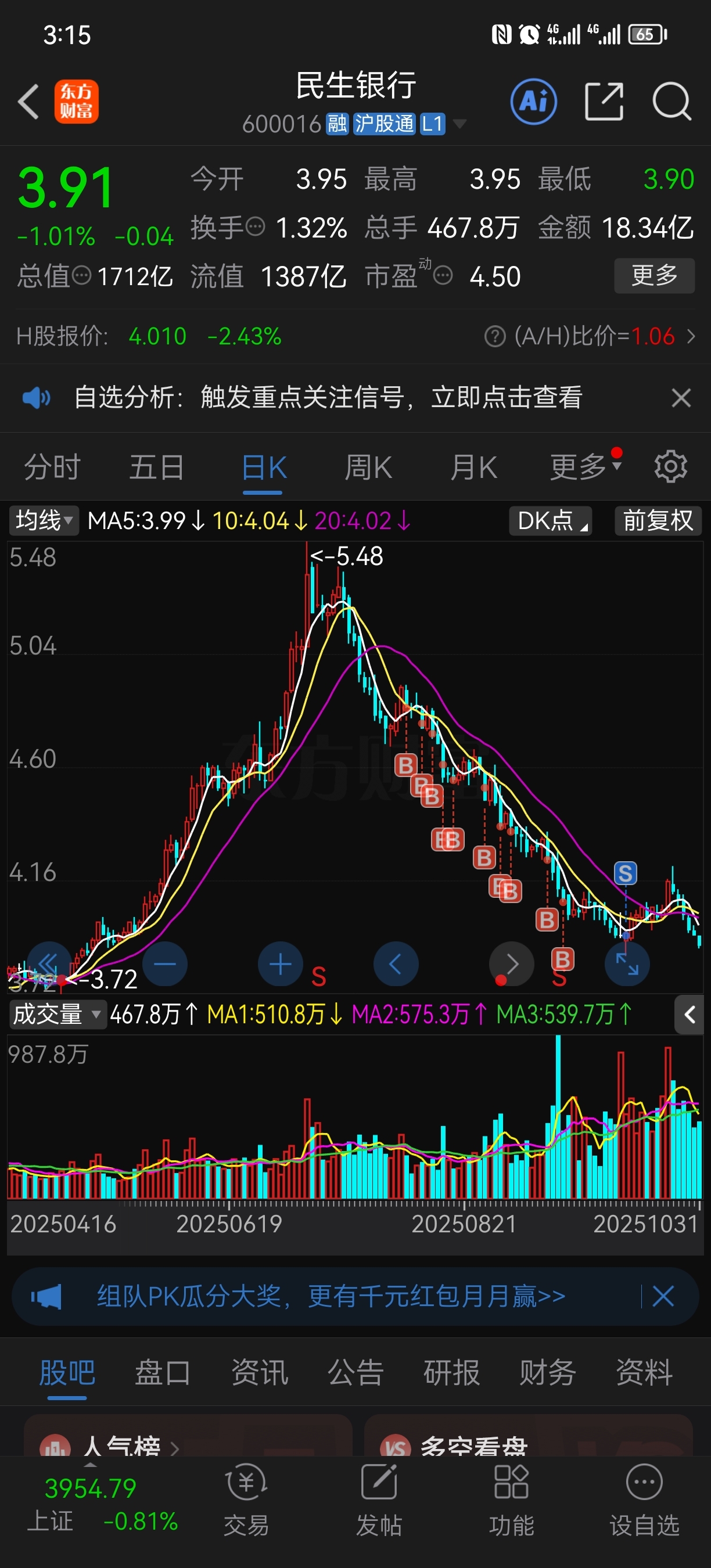 $民生银行(SH600016)$  一路下跌,一路补仓,然后全部割在最低点。反向操作高手就是我。