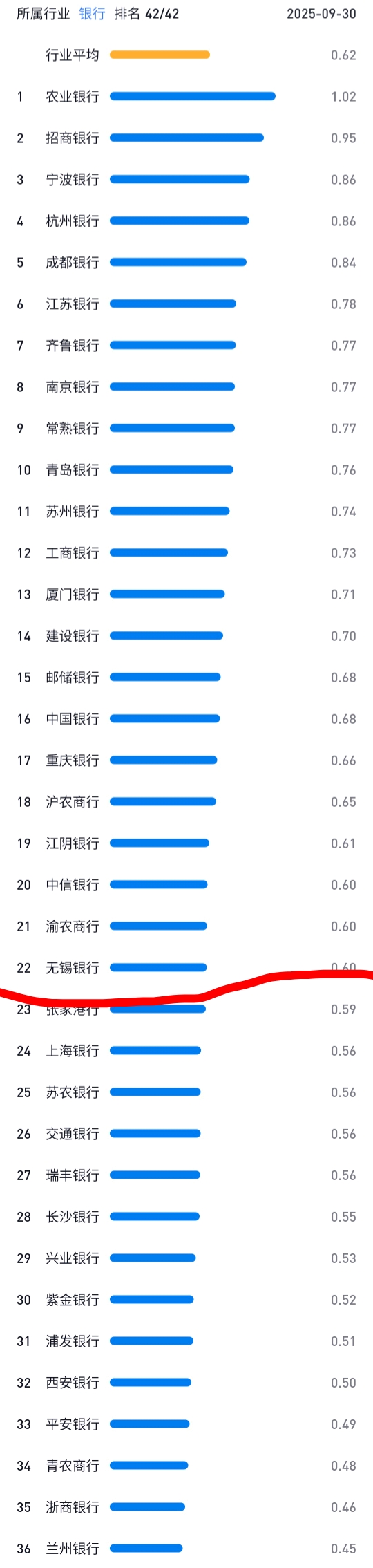 $农业银行(SH601288)$ 42家银行市净率第一刚刚回到净资产,第21位中位数是市净率是0.6,倒数第一的是0.3市净率,分红率5%$渝农商行(SH601077)$ $民生银行(SH600016)$