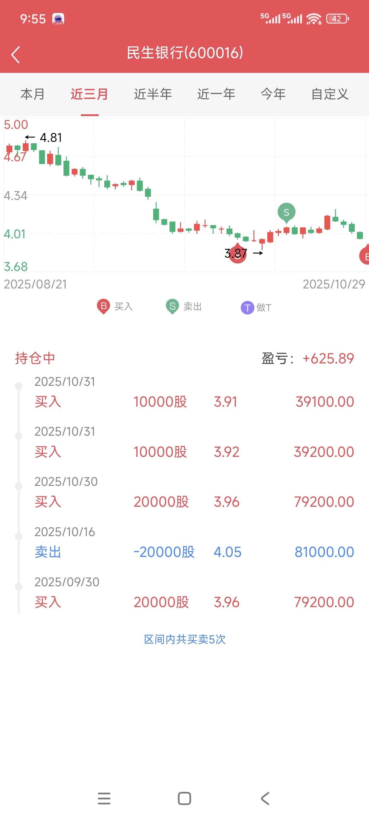 $民生银行(SH600016)$  低于4.00就买,高于4.00就卖。