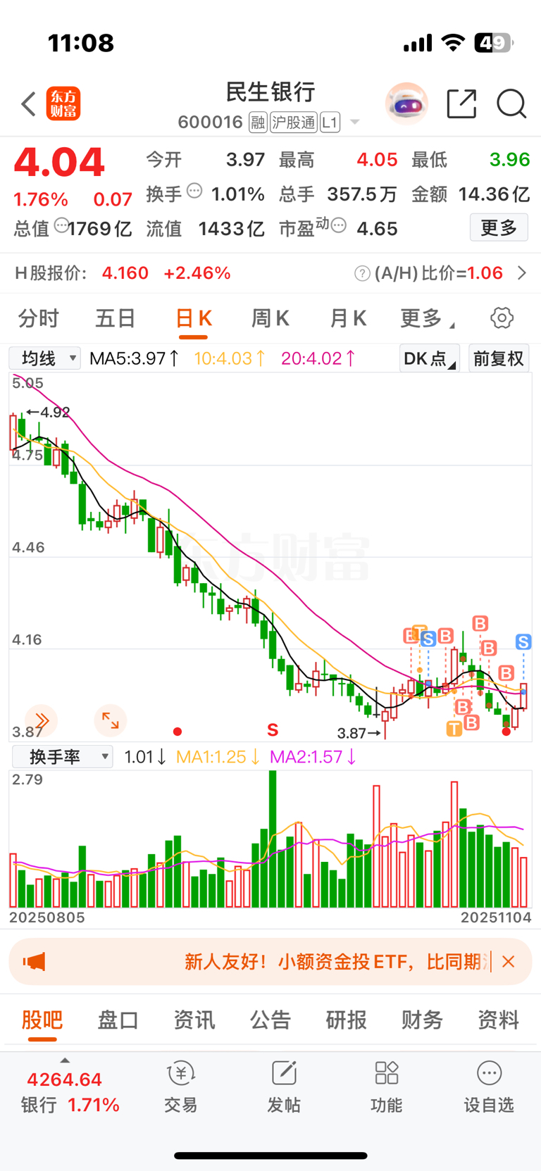 $民生银行(SH600016)$ 从几千股补到十几万股,太吓人了,4.03 走赚个白菜钱,不玩这只了