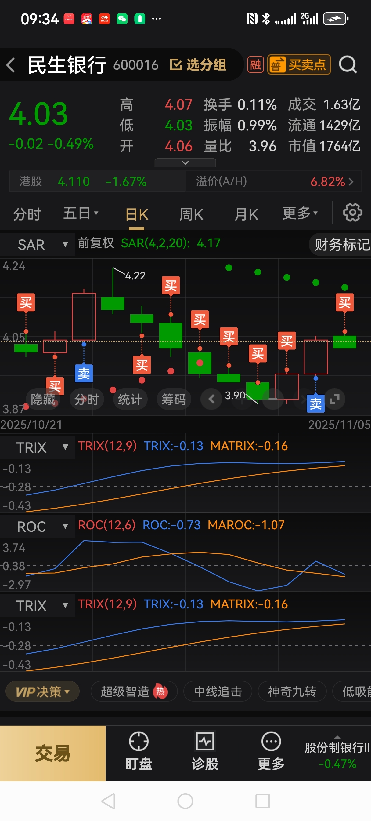 民生银行,昨天获利清仓4.05,11月5号,已建仓4.03。