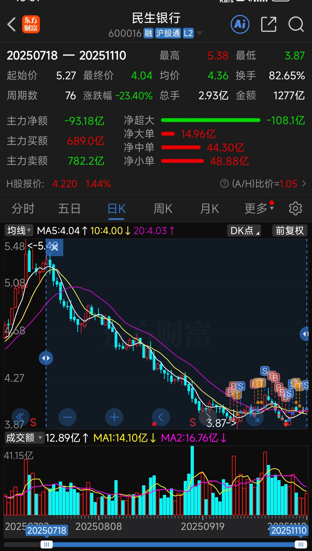 $民生银行(SH600016)$ 明天双十一,能打折买吗?主力把价格打下去。