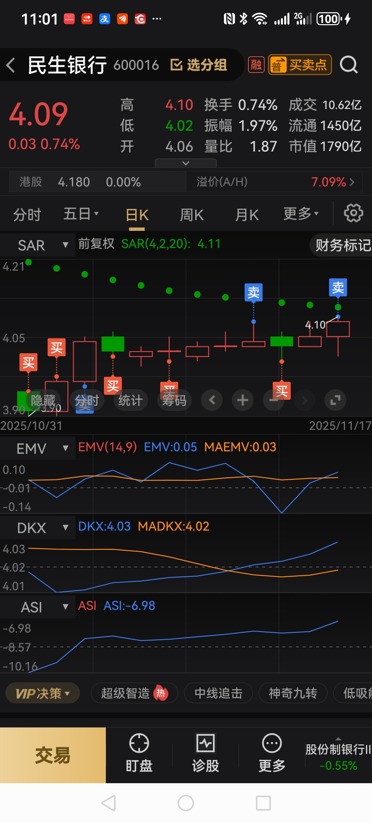 民生银行,11月14号,清仓4.09失败,11月17号,获利清仓4.09(7*3