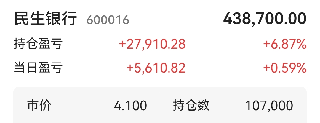 $民生银行(SH600016)$ 清仓公告:本人持有股份:107000,因浮盈己超过5%的计划利息,决定由下个交易日起五个交易日内以不低于4.11的价格清仓。特此公告。