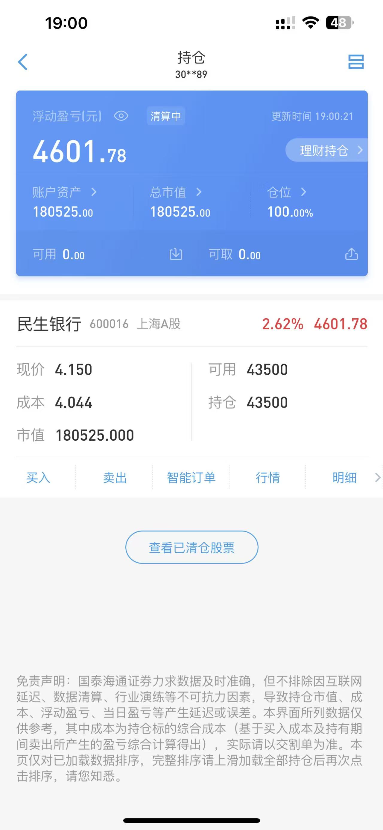 我20万7月份4.73全仓购入,然后一路跌。经历了3.5 3.9 4.0 4.1区间反复,终于10月那样抗住不了4.11全仓卖出,加上半年分红的5300来块钱,然后4.04成本全仓接回来了。持股数依然还是43500股。目前民生亏2万,不知道几时能回本,实在不行只能做民生的股东了。