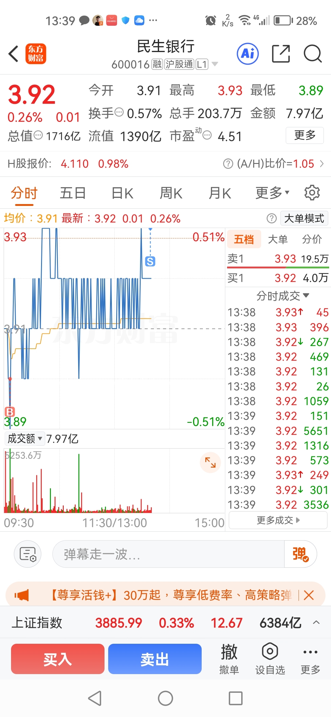 $民生银行(SH600016)$ 早上9:39挂的3.93元卖出的单。在下午1:39终于成交了。