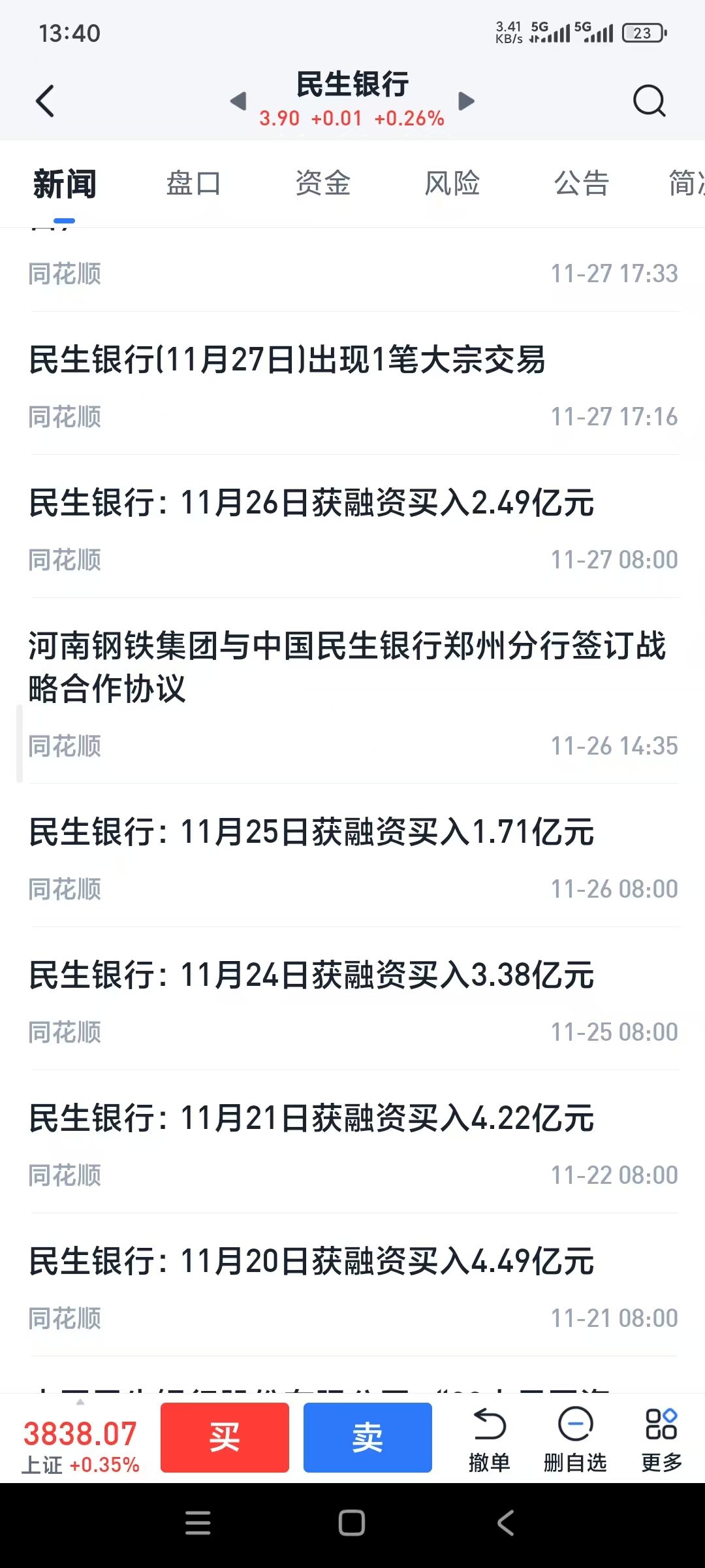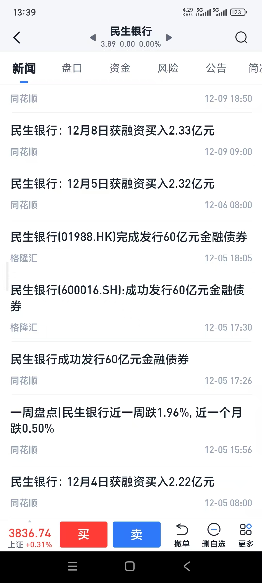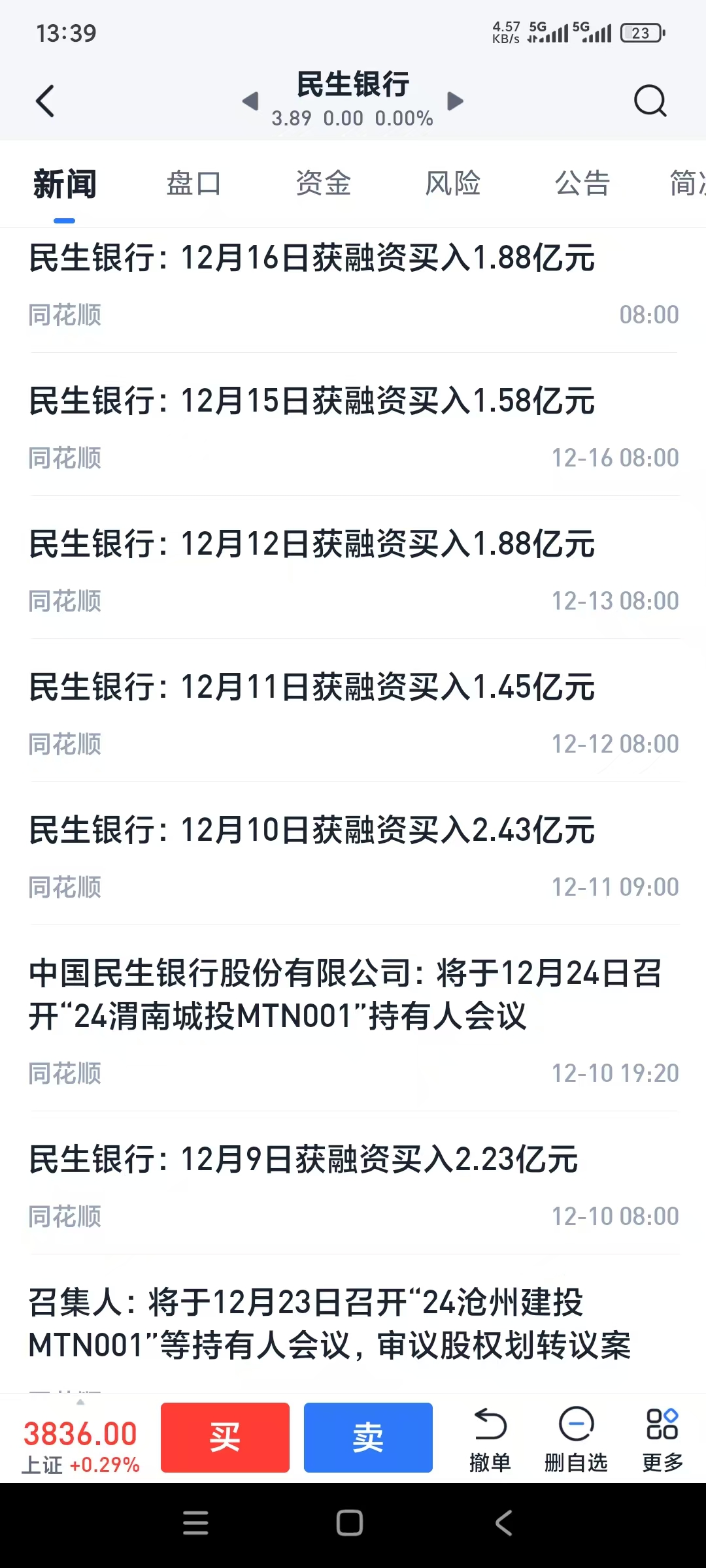 民生银行连续3个礼拜获得融资买入,累计好几十个亿,今天我没理由不跟,遵循倒金字塔买入的原则(越跌越买,越买越多),今日买入稍微多了一些;如果主力还要继续砸,最好1毛到两毛以上,我会继续买入更多并晒图,以实现我的承诺