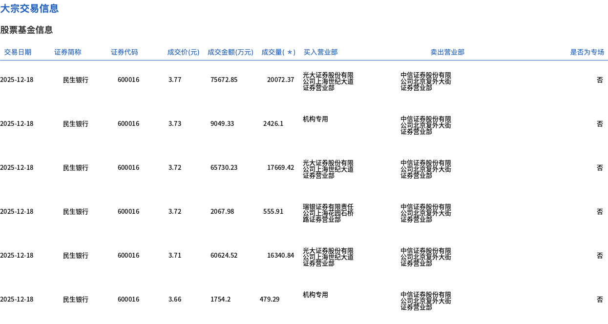 12月18日,民生银行大宗交易成交5.75亿股,成交额21.49亿元,占当日总成交额的66.17%,成交均价3.73元,较市场收盘价3.93元折价4.97%,其中最高成交价3.77元,最低成交价3.66元。