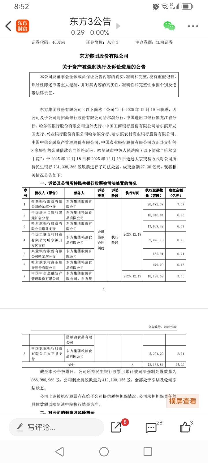 $民生银行(SH600016)$ 为保护民生银行广大股民利益,应该申请法院强制卖出东方集团所持民生银行股份,偿还民生银行的贷款。再不动手,毛都没有了!