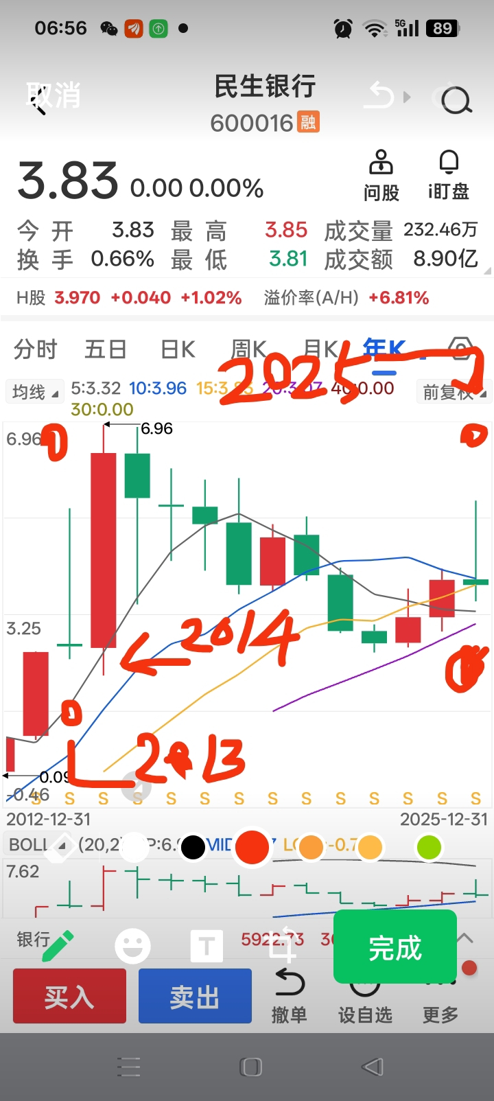 $民生银行(SH600016)$ 大家看看2013年K线图和2025年走势几乎一模一样。那么预测民生2026年也和2014年走势一样暴涨。