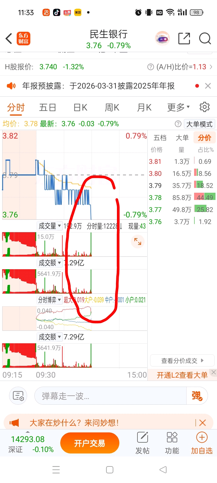 $民生银行(SH600016)$ 这种大卖单百分之一百是主力卖出,散户是搞不出来的。